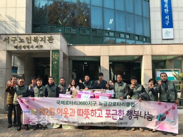 행사에 참여한 뉴금강로타리클럽 회원은 “추운 겨울 혼자서 쓸쓸하게 보내실 어르신들에게 후원물품 전달을 통해 몸과 마음이 든든한 겨울을 보내실 수 있도록 마음을 모았다.”며 “어르신들과 따듯한 정을 나누다보니 보람을 느낀다.”며 소감을 밝혔다.