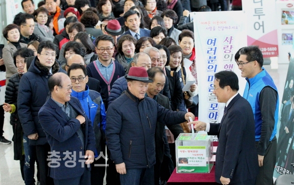 대전 동구(구청장 한현택)는 15일 구청 1층 로비에서 자생단체, 주민 등 300여 명이 참여한 가운데 ‘주민과 함께하는 행복연탄 나누기’ 후원금 모금행사를 펼쳤다.