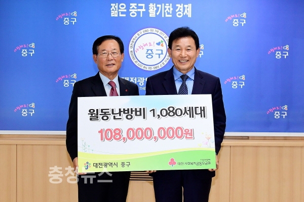대전 중구(구청장 박용갑)은 대전사회복지공동모금회(회장 안기호)로부터 1억 800만원의 월동 난방비와 한국가스공사 대전충청지역본부(본부장 오무진)에서 각각 1천만원의 성금을 기탁받았다고 밝혔다.