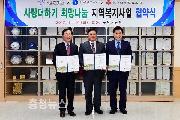 한국가스공사 대전충청지역본부는 1천만원의 성금을 중구의 특수시책 ‘희망! 2040 이웃사랑’모금사업에 기탁하고 2018년부터 5년간 매년 2천만원씩 총 1억원의 사업을 함께 추진하기로 하는 협약을 체결했다.