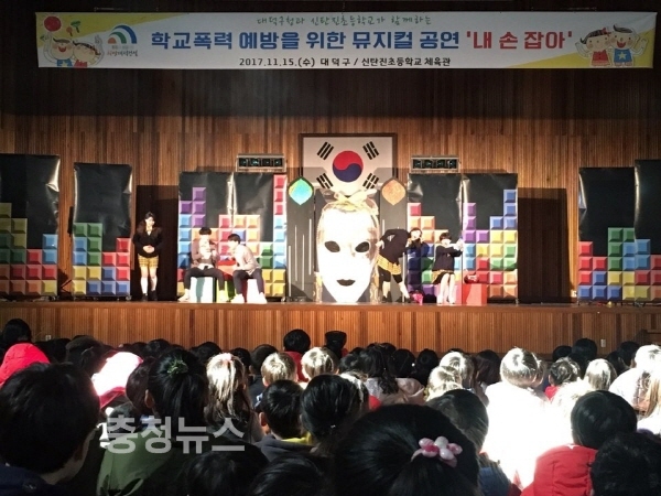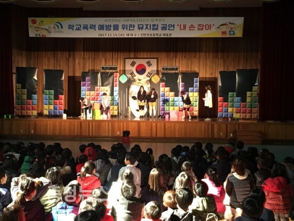 대전 대덕구(구청장 박수범)는 15일 오전 신탄진초등학교 체육관에서 신탄진초등학교 학생 500여명을 대상으로 찾아가는 학교폭력 예방 뮤지컬 공연을 펼쳤다.