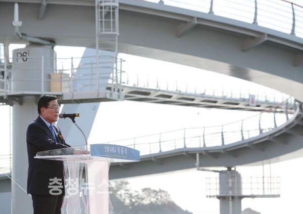 안흥나래교 개통식에서 한상기 태안군수 축사 모습