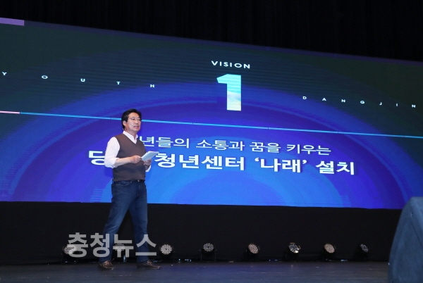 김 시장이 이날 발표한 7대 비전은 ▲당진 청년센터 ‘나래’설치 ▲당진형 청년 뉴딜정책 추진 ▲민간분야 청년 생활임금제 도입 ▲당진청년 종합건강검진 지원 ▲시립 돌봄센터 설치 ▲청년 공유재단 설립 ▲당진시 청년민회 구성이다.