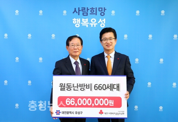 대전 유성구(구청장 허태정)는 17일 구청 행복사랑방에서 대전사회복지공동모금회(회장 안기호)로부터 따뜻한 겨울나기 지원사업의 일환으로 동절기 저소득층 가정을 위한 월동난방비 전달식을 가졌다고 밝혔다.