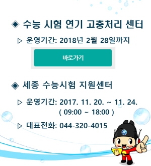 세종시교육청(교육감 최교진)은 2018학년도 대학수학능력시험 연기로 인한 관내 학생·학부모의 궁금사항을 해소하기 위해 ‘세종 수능시험 지원 센터(이하 지원 센터)’를 운영한다.