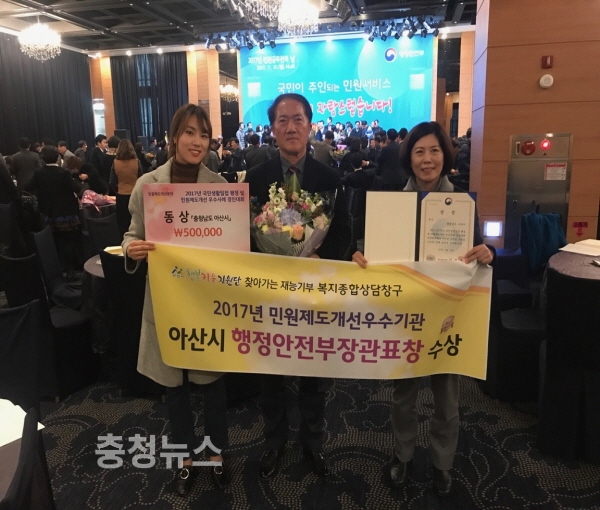충남 아산시(시장 복기왕)는 지난 20일 2017년 국민생활밀접 행정·민원제도 우수사례 경진대회에서 민원분야 우수사례로 선정돼 행정안전부장관 기관 표창을 받았다.