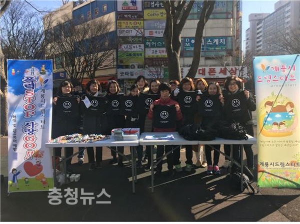 계룡시 드림스타트와 지역사회복지협의체 아동보육교육분과위원회가 함께 진행한 이날 캠페인은 아동학대에 대한 사회적 인식을 높이고 피해자(아동)의 조기발견을 위한 주변의 적극적인 대처를 유도하고자 마련됐다.