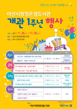 충남 아산시립도서관(관장 권경자)은 탕정온샘도서관 개관 1주년을 맞아 그 동안의 도서관 운영을 돌아보고 지역주민을 위한 문화공간으로써의 도서관 역할을 공고히 하고자 이달 28일부터 30일까지 탕정온샘도서관에서 다채로운 행사를 개최한다.