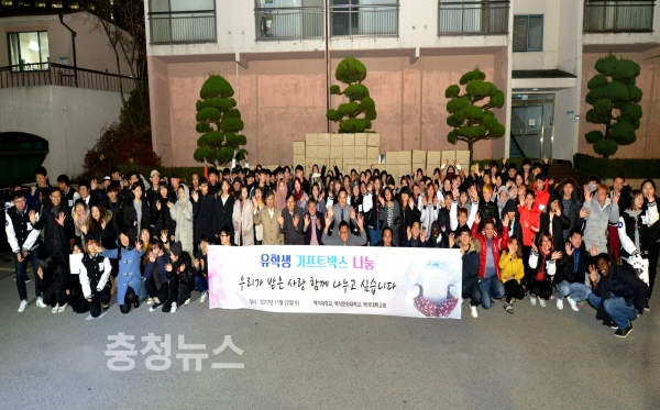 백석대학교(총장 장종현)는 지난 22일 오후 9시 교내 기숙사 믿음동 앞에서 타지에 나와 고생하고 있는 백석대 유학생 약 180명을 대상으로 ‘기프트 박스’를 전달했다.