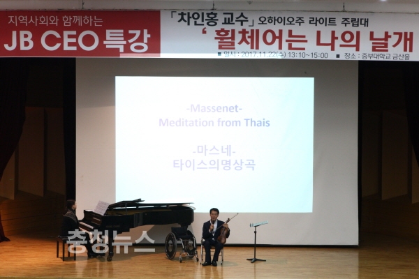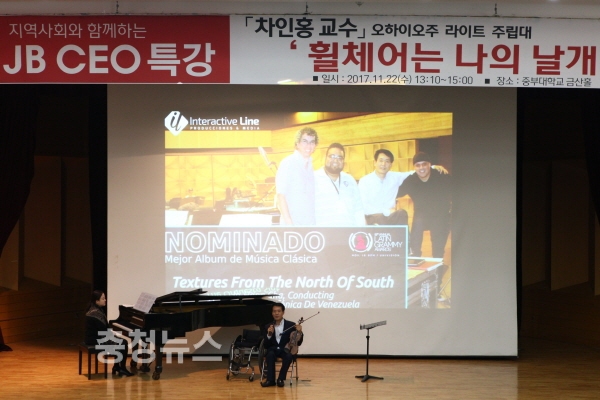 이날 ‘휠체어 탄 지휘자’로 널리 알려진 미 오하이오주 라이트 주립대학 차인홍 교수는 중부대 강단에 올라 ‘휠체어는 나의 날개’라는 제목의 특강과 함께 바이올린 연주를 선보였다.