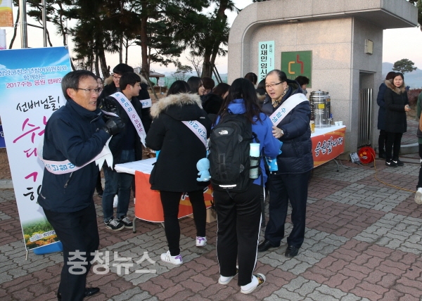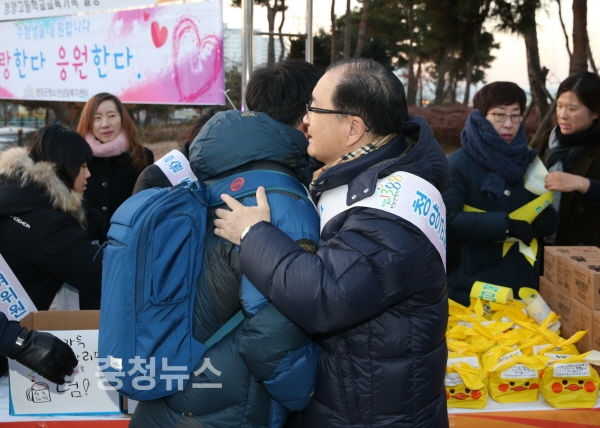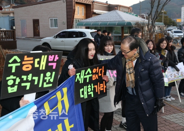 이석화 청양군수가 23일 2018학년도 대학수학능력시험 고사장 청양고등학교 앞에서 입실하는 수험생들의 긴장을 풀어주며 격려와 응원을 보냈다.
