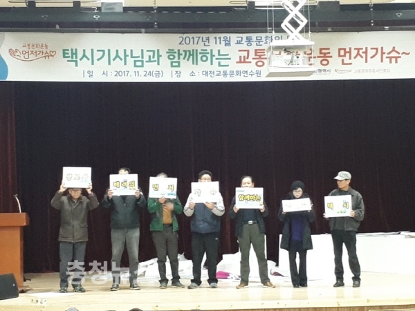 대전시는 24일 ‘11월 교통문화의 날’을 맞아 대전교통문화 연수원 다목적교육관에서 택시운전기사님과 함께하는 먼저가슈 교통문화운동 실천다짐 행사를 가졌다.