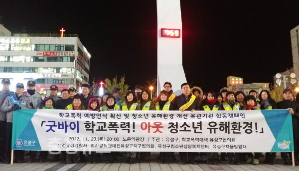 또 이날 노은역 광장 일원에서는 유성구협의회 주관으로 관내 유관기관 100여명이 참여해 청소년의 일탈행위를 사전에 차단하고 학교를 넘어 사회적인 문제가 되고 있는 학교폭력에 대해 주민인식 개선을 위해 학교폭력 옐로카드 홍보물 배부, 업소별 방문 청소년 유해행위 금지 계도활동도 전개됐다.