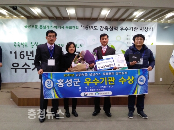 충남 홍성군(군수 김석환)이 환경부에서 실시한 2016년 ‘공공부문 온실가스·에너지 목표관리’ 이행실적 평가에서 ‘전년대비 감축률 상승 우수기관’으로 선정돼 기관상과 함께 3천만원의 포상금을 받았다.
