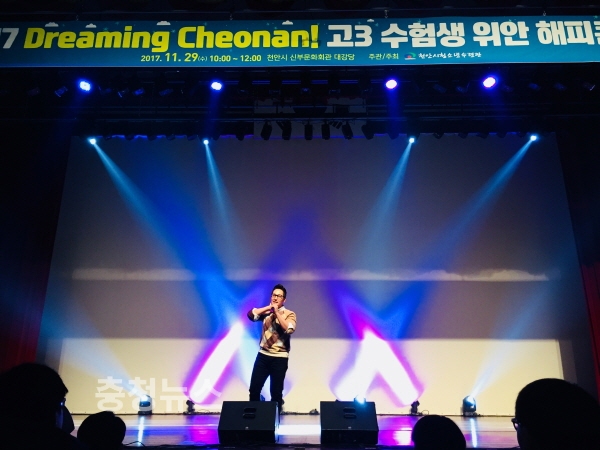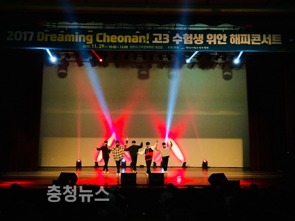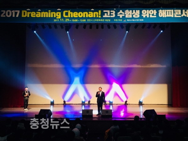 충남 천안시청소년수련관(관장 유준수)이 주관한 ‘2017 고3 수험생을 위한 해피콘서트’가 관내 2개 고등학교 3학년 청소년 1000명과 교사, 학부모 등이 참여한 가운데 29일 천안시민문화회관 대강당에서 성황리에 열렸다.