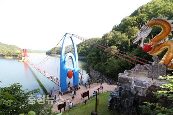 고요한 천장호를 가르며 상하좌우 흔들리는 스릴 만점 출렁다리는 탁 트인 풍경과 함께 어우러져 청양의 대표 명소로 자리 잡았다.