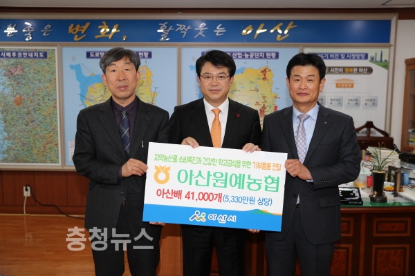 충남 아산원예농협(조합장 구본권)이 지난 28일 올가을 농가에서 수확한 배 4만 1천여개 (오천삼백여만원 상당)를 아산시에 기부했다.