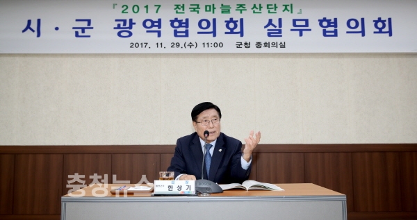 충남 태안군이 지난 29일 군청 중회의실에서 한상기 군수를 비롯, 11개 시·군 관계자 및 농협관계자 등 40여 명이 참석한 가운데 ‘2017 전국 마늘주산단지 시·군 광역협의회(의장 한상기 태안군수) 실무협의회’를 개최했다.