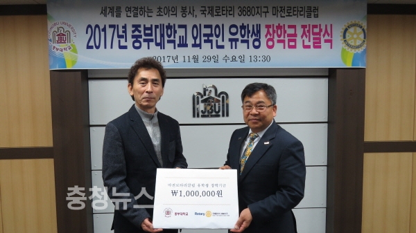 양 기관은 지난 2017년 3월 21일 매년 100만원을 외국인 유학생을 대상으로 장학금을 지급을 위하여 이와 관련하여 협정을 체결한바 있으며, 그에 따라 이번에 처음으로 로타리클럽이 중부대에 장학금을 전달한 것이다.