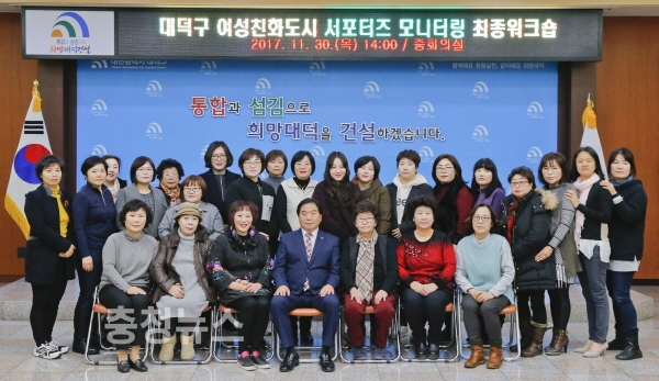 대덕구, 여성친화 정책 주민 모니터링 활동 최종 워크숍대전 대덕구(구청장 박수범)는 30일 구청 중회의실에서 올해 실시한 주민참여단의 여성친화 정책 모니터링 활동 내용을 상호 공유하고, 2018년 활동계획과 발전방향에 관한 의견을 수렴하는 최종 워크숍을 가졌다.