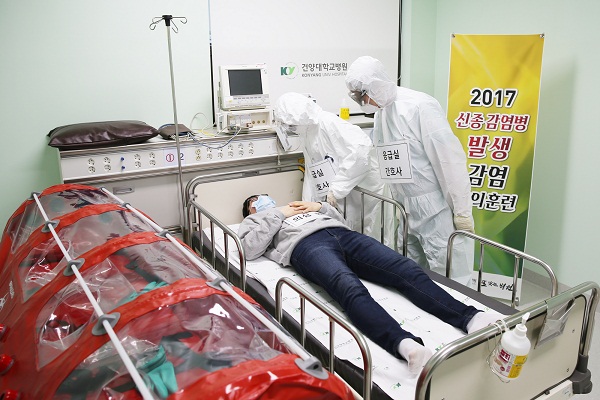 건양대병원은 메르스 등 신종 감염병 의심환자가 발생한 것을 설정해 대규모 모의훈련을 실시했다. 사진은 응급실 간호사가 감염병 의심환자를 음악격리병실로 옮긴 후 각종 처치를 시행하는 모습.