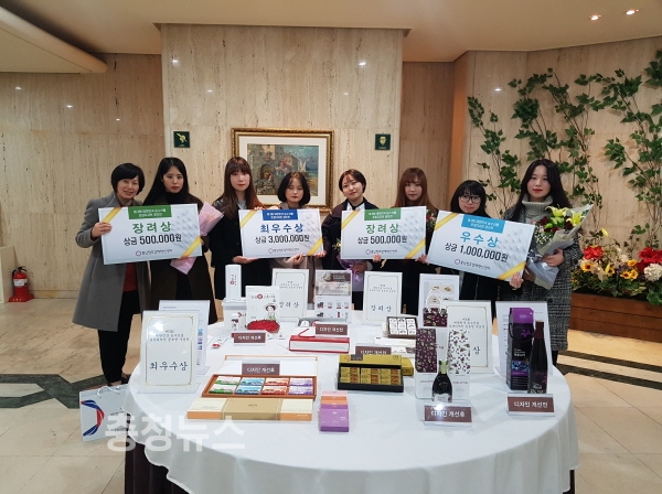제3회 대한민국 농수산품 포장디자인 공모전에서 수상한 상명대 수상자 기념사진(테이블 위 학생 출품 작품)