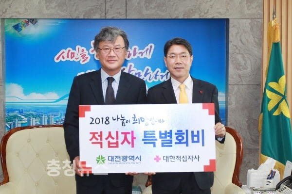 이재관 대전시장 권한대행은 4일 오전 11시 시청에서 대한적십자사 대전세종지사 정상철 회장에게 2018년도 적십자 특별회비 500만 원을 전달했다.