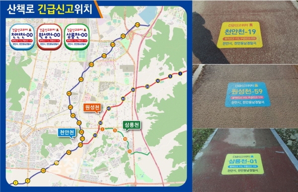 또 동남구 원성동‧봉명동‧문성동 일원 여성안심구역에 태양광 표지병과 로고젝터를 설치하고, 천안천 등의 하천산책로에 긴급신고 위치표지 등을 설치해 시민들이 쉽게 신고할 수 있도록 했다.