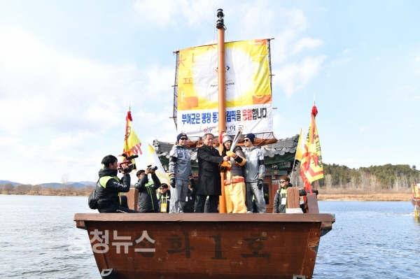 5일 부여에 도착한 성화는 부여군 성화봉송 첫 번째 주자인 김철회(부여군체육회 감사)씨에게 전달되어 오후 1시10분 백마강유람선 선착장에서 황포돛배를 타고 부소산 낙화암을 돌아 규암의 자온대까지 이동했다.