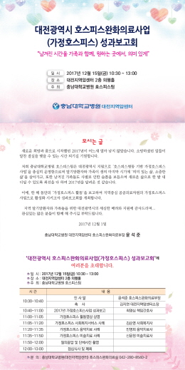 이번 보고회는 대전광역시 지원으로 전국 최대규모의 가정호스피스사업을 선도적으로 운영하고 있는 충남대학교병원 대전지역암센터 호스피스팀 주관으로 진행된다.