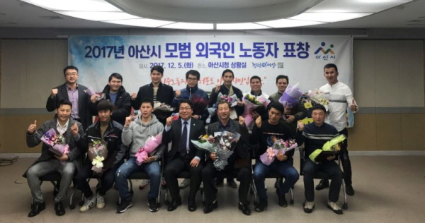 충남 아산시(시장 복기왕)는 지난 5일 아산시이주노동자센터(소장 우삼열)가 주최해 개최한 2017년 아산 이주민 인권문화 축제인 ‘마실’행사를 기념하기 위해 아산시청 상황실에서 『2017년 아산시 모범 외국인노동자 표창』수여식을 가졌다.