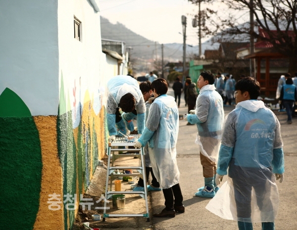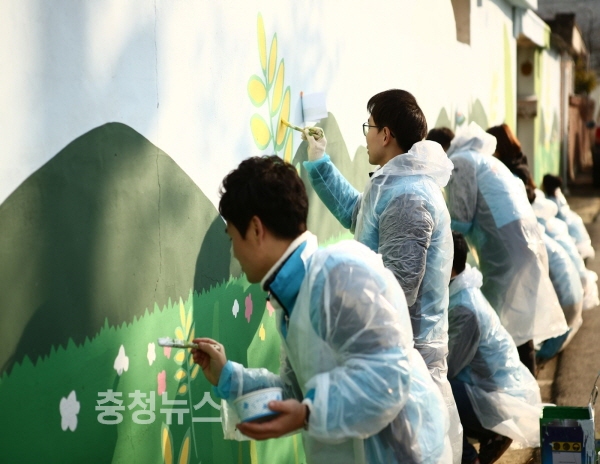 이날 양 기관 임직원 60명이 참여해 평리 마을회관 인근 담장 50m에 벽화그리기를 실시했다. 평리마을의 자랑거리인‘친환경 유기농업’을 주제로 마을의 우수한 농산물 등을 벽화로 표현했다.