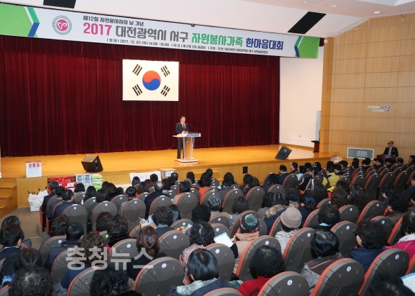 대전 서구(구청장 장종태)는 7일 구청 대강당에서 (사)서구자원봉사센터 주관으로 자원봉사자 300여 명이 참석한 가운데 ‘2017 서구자원봉사가족 한마음 대회’를 개최했다고 밝혔다.