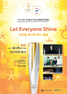 내년 2월 9일부터 25일까지 17일간 강원도 평창·강릉·정선 일원에서 열리는 ‘2018 평창동계올림픽’의 성화봉송이 그 열기를 더해가는 가운데 오는 17일 천안에 ‘모두를 빛나게 하는 불꽃’이 온다.