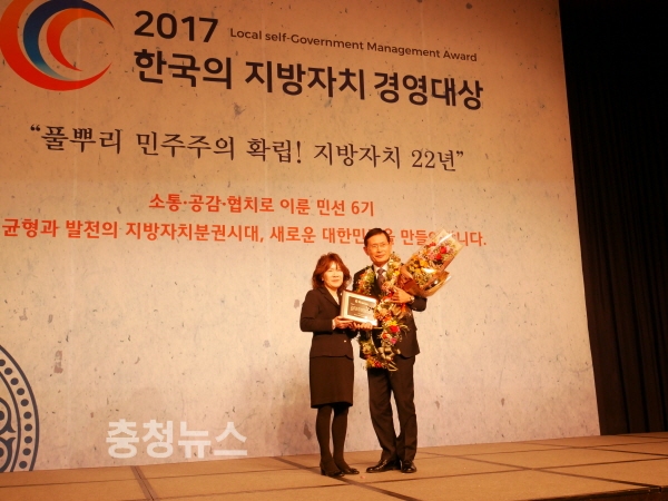 동아일보가 주최하고 행정안전부가 후원하는 ‘2017지방자치경영대상’은 국제화, 산업, 청년정책, 문화관광, 환경보존, 일자리 창출, 주민 복지 등 20개 부문을 두고 엄격한 전문가 심사를 거쳐 행정혁신에 탁월한 성과를 거둔 지자체에게 주어지는 상이다. 시상식은 13일 서울 밀레니엄 힐튼호텔에서 있었다.
