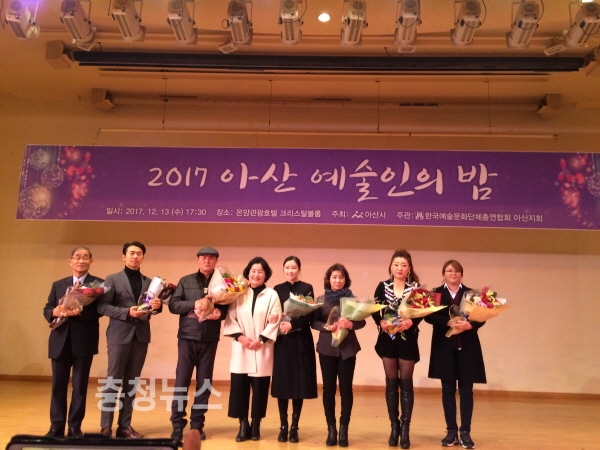 한 해 동안 지역 문화예술계 성과를 바탕으로 이루어진 시상에는 10개 단체에서 수상자가 선정되었으며, 그 중 아산시장상은 예총아산지회 김원근 수석부회장이 수상하고, 2017 아산 예술인의 상에는 영화인협회 이동영 아산지부장이 수상했다.