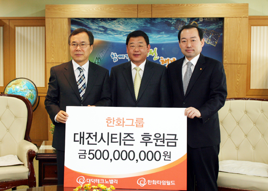 이에 (주)대덕테크노밸리 정승진 대표이사는 “한화그룹은 대전·충청의 향토기업으로서 지속적으로 시민들의 기대에 부응하고 지역 스포츠발전에 기여할 수 있어 기쁘다”며 “대전시티즌이 한화이글스와 함께 대전, 충청을 대표하는 명문 구단으로 거듭나길 기원한다”고 말했다.
