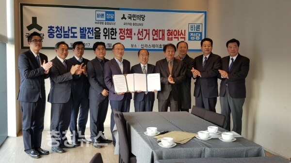 양당은 18일 오후 신라스테이호텔에서 2018년 6.13 지방 선거를 앞두고 충남발전을 위한 정책 발굴과 지방선거 후보연대를 추진할 정책연대와 선거연대 협의체를 구성하고 공동합의문 협약식을 통해 양당체제의 정치적 현실을 개혁하겠다는 의지를 밝혔다.