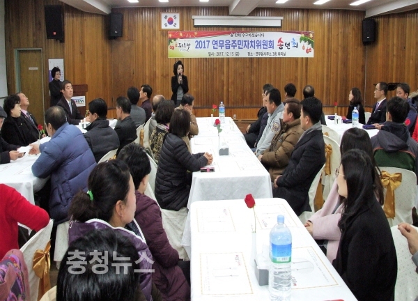 연무읍주민자치위원회는 지난 15일 오후 연무읍사무소 3층 회의실에서 김형도 논산시의회 의장, 임종진 이금자 논산시의원, 전경애 연무읍장, 김회택 노인회장, 안일순 연무읍번영회장, 자문위원, 고문, 자치위원, 연무읍 직원 등 100여명이 참석한 가운데 2017년 송년회를 개최했다.