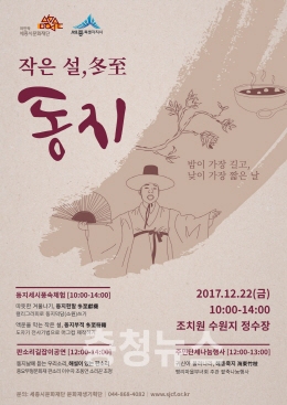 세종시문화재단(대표이사 인병택) 문화재생기획단은 오는 22일 조치원 정수장에서 주민과 함께하는 ‘2017 작은 설 동지(冬至)’ 행사를 개최한다.