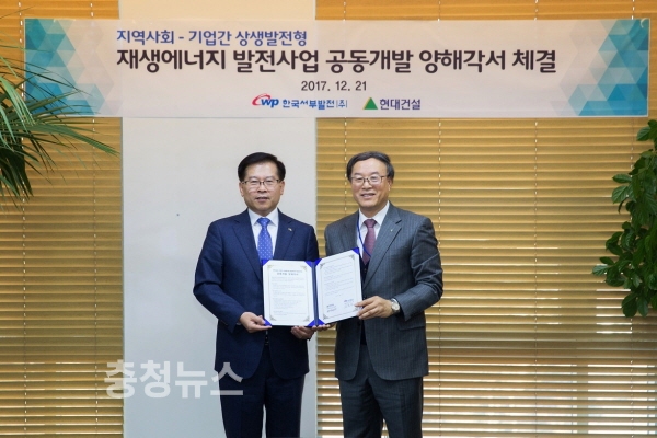 한국서부발전 김동섭 기술본부장(왼쪽)과 현대건설변동언 본부장이 양해각서를 체결하고 기념촬영한 모습