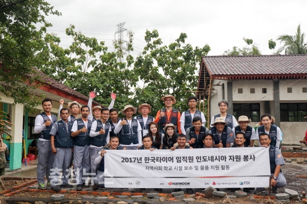 한국타이어(대표이사 서승화)가 지난 19일부터 21일까지 3일간 인도네시아 브카시(Bekasi) 지역에 위치한 ‘메달초등학교’에서 한국과 인도네시아 임직원들이 함께 어린이들의 교육 환경을 개선하는 봉사활동을 진행했다.