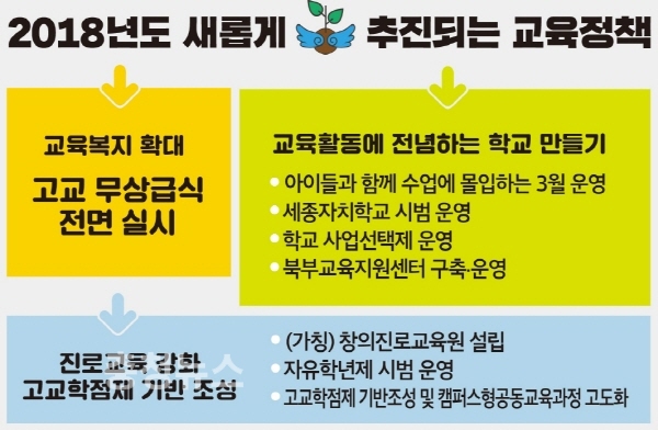 최교진 세종시교육감은 26일 “문재인 정부의 본격적인 지방교육자치시대에 맞춰 2018년 새롭게 추진되는 주요 정책으로 ▲ 고교 무상급식 전면 실시 ▲ 세종자치학교 ▲ 학교 사업선택제 ▲ 북부교육지원센터 ▲ 고교학점제 등 세종시에 특화된 교육자치를 실현하겠다”고 밝혔다.