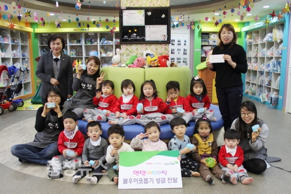 엔젤어린이집에서는 매년 연말이 되면 아이들과 부모님이 한달 간 저금통에 후원금을 모아 도움이 필요한 이웃들에게 나눔을 실천하고 있다.