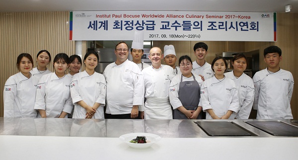 ▲폴 보퀴즈 주관 글로벌 외식조리대학 연맹 멤버 선정=우송대는 지난 2015년 프랑스 유명 외식조리대학인 폴 보퀴즈(Institut Paul Bocuse)가 주관하는 글로벌 외식조리대학 연맹 Institut Paul Bocuse Worldwide Alliance(폴 보퀴즈 월드와이드 얼라이언스)의 15번째 멤버로 선정됐다. 특히 교수 및 학생교류, 재학생 연수 파견, 세미나 개최 등 폴 보퀴즈와 긴밀한 협력을 통해 올해 9월 폴 보퀴즈 공동학위과정도 개설했다. 호텔외식조리대학 및 솔 인터내셔널 스쿨 조리 관련 전공 2학년을 대상으로 50명을 선발해 일정기간 영어 집중교육 후 3년간 프랑스 현지와 동일한 과정을 이수한 후 졸업하면 양 대학의 학위를 모두 수여한다. 이와 관련, 우송대는 지난 9월 18일부터 5일 동안 아시아 최초로 제9회 ‘2017 세계 외식조리대학 연맹 세미나(Institut Paul Bocuse Worldwide Alliance Alliance Culinary Seminar 2017)’를 개최했다. 4개 대륙 12개 국가에서 외식조리 및 호텔경영분야 전문가 28명이 참석하였으며 다섯 번의 조리시연회와 간담회도 열었다.