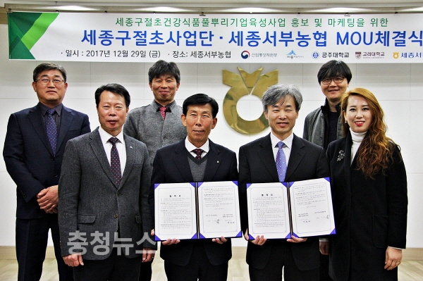 세종구절초 건강식품 풀뿌리기업 육성사업단(사업단장 공주대 식품공학과 박윤제 교수)는 29일 세종시 장군면에 위치한 세종서부농업협동조합(조합장 이성규)와 업무협약을 체결했다.