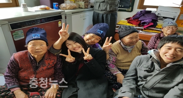 학생들은 천안과 아산 지역 노인 대학‧회관을 돌며 털모자를 전달했다. 이들은 어르신에게 큰 절하고, ‘엄마야 누나야’ 합창으로 정(情)을 전달했다.