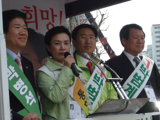 통합민주당 강금실 최고위원은 5일 오후 대전 서구 월평동 백합사거리에서 박범계 후보와 박병석 후보의 지원유세를 펼쳤다.