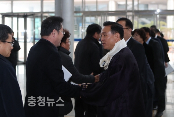 2018년 시무식에서 직원들과 악수하는 구본영 시장 모습