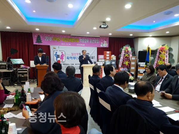 충남 부여군 여성단체협의회(회장 박순화)에서는 지난달 29일 새천년웨딩홀에서 여성단체협의회 회원 180명이 참석한 가운데 여성단체지도자 역량강화 송년모임을 가졌다.